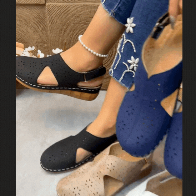Diseño ergonómico, suela de madera natural y detalles perforados para mayor transpirabilidad.